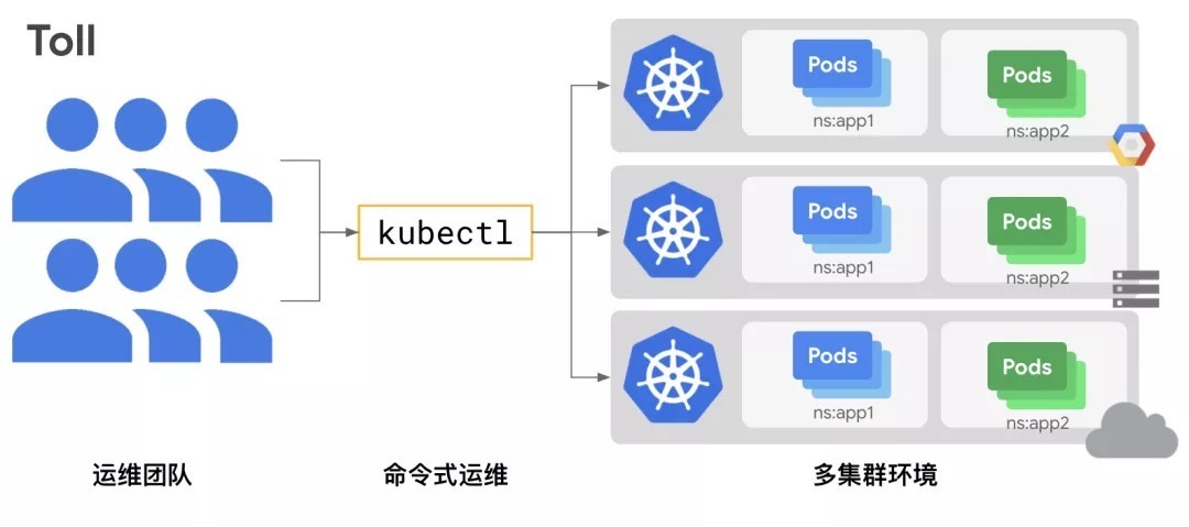 传统的配置管理是命令式运维,用kubectl连接不同集群执行相应的操作,这样的方式会带来一系列的问题,第一个问题是命令难以重用,在一个集群下的命令,在另外一个集群又得执行一遍;所运行命令也难以审计和追溯;另外命令式运维安全度相对较低,生产环境中绝大多数的故障都是人为误操作,并且故障难以回滚,因为很多时候无法得知哪条命令导致了集群的故障。谷歌的SRE运维理论里有一个词来形容这种人工重复低效操作叫Toll。