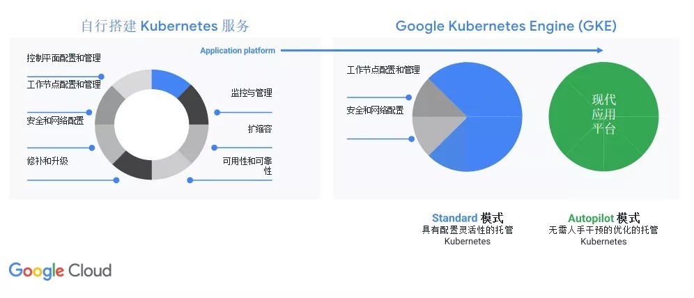 三 底座, 传统环境,如果要使用Kubernetes服务,控制、数据、运维平面等等都需要用户自己处理。谷歌提供两种托管Kubenetes服务,第一种是Standard GKE,属于半托管模式,客户可以定义节点、网络与安全的配置,Google Cloud负责控制与运维平面;对于一些不想管理这些节点,甚至不想感觉到这些节点存在的客户, Google Cloud也提供Autopilot模式,无需人手干预的全托管Kubernetes服务,资源弹性伸缩,根据所占用资源计费。用户只需使用Kubernetes的接口即可部署应用。