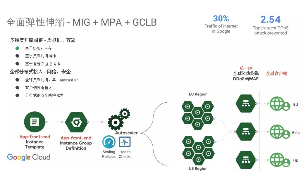 二 网络:Google Cloud 是全球一张网,提供全球一个VPC,各区域互联互通的能力。想象一下传统环境,如果要把分布式应用部署在全球各个数据中心,各个数据中心可能会有专门的互联网出入口,网络和安全能力要依据每个数据中心进行规划,相对繁琐。而Google Cloud的全球网络能力,可以让部署在全球各个区域的业务,只需要一个负载均衡,一个VIP,就可以提供给全球各地客户端就近接入,并且具备无上限的安全能力。全球互联网30%的流量都在谷歌中,有史以来最大规模的DDOS攻击——2.54TB,也发生在谷歌,而谷歌对这次攻击几乎无感。