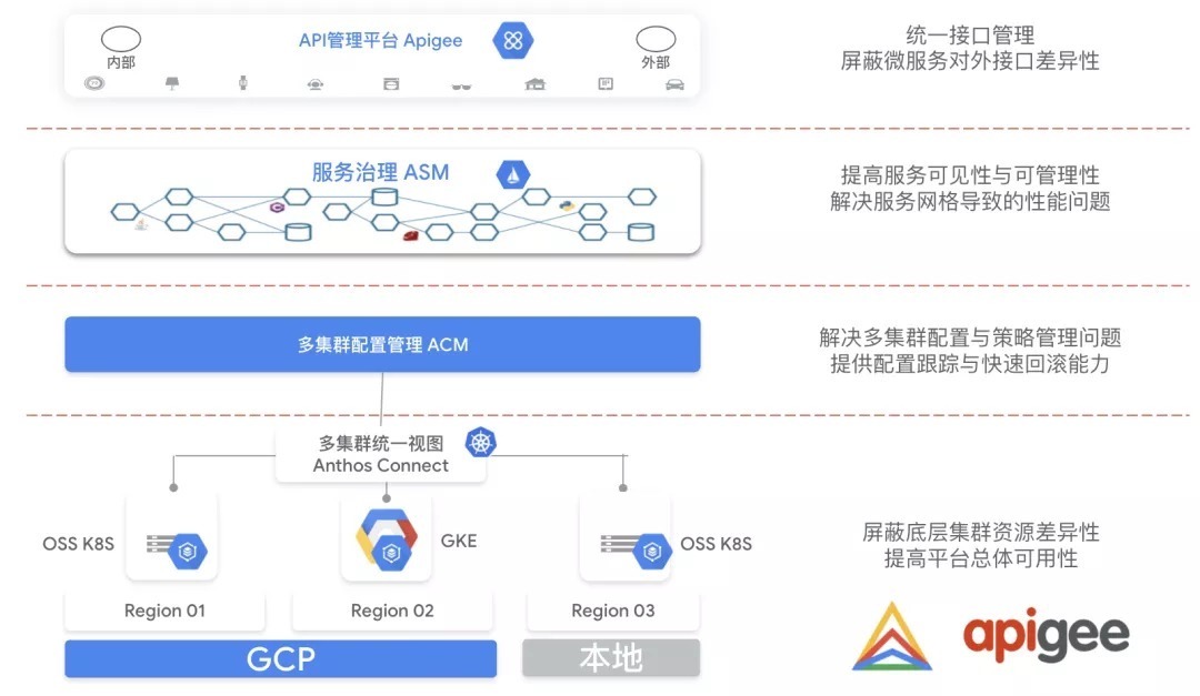 陈子升最后总结与回顾所介绍的内容:企业要部署分布式应用时,可能会部署在不同的环境,这涉及到多环境统一管理的问题,Anthos可以连接不同的区域、云和环境,可以屏蔽集群之间的差异性。在此之上需要对不同的集群进行配置和策略管理,Anthos Config Manager以GitOps的思想帮忙用户高效进行配置管理;在此底座之上部署微服务应用,会涉及到微服务治理问题,Anthos Service Mesh可以帮助客户更方便地进行微服务治理,同时解决服务网格的sidecar导致的性能问题;当部署完服务之后,如果需要将服务发布出去给第三方使用,就涉及到服务运营的问题,Apigee API管理平台就是服务于此,可以屏蔽对外接口的差异性,帮助客户做更好的服务运营。